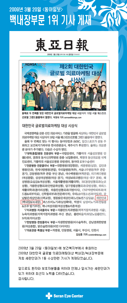 [동아일보] 백내장부문 1위 기사 게재 - 병원소식