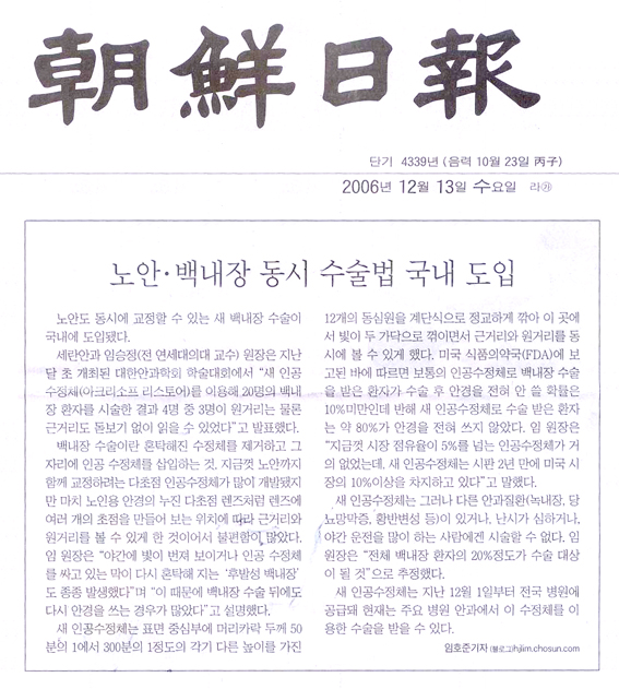 [조선일보]노안 · 백내장 동시 수술법 국내 도입