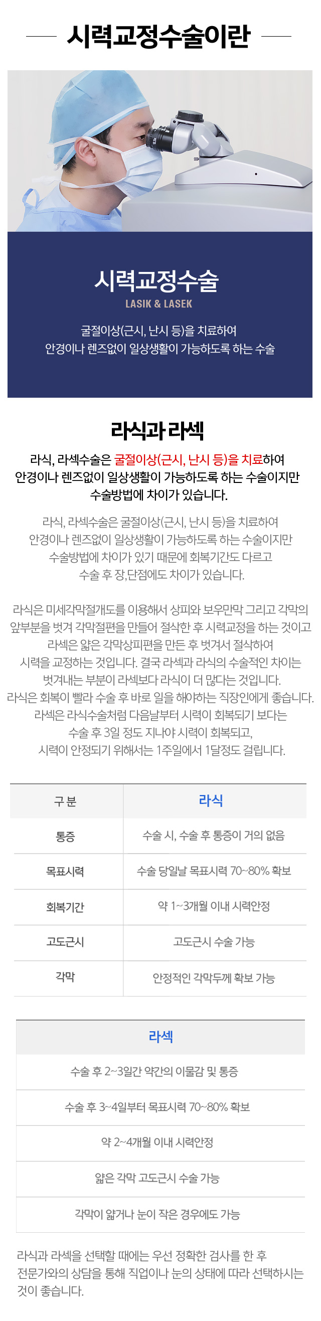 라식, 라섹수술은 굴절이상(근시, 난시 등)을 치료하여 안경이나 렌즈없이 일상생활이 가능하도록 하는 수술이지만 수술방법에 차이가 있기 때문에 회복기간도 다르고 수술 후 장,단점에도 차이가 있습니다. 라식은 미세각막절개도를 이용해서 상피와 보우만막 그리고 각막의 앞부분을 벗겨 각막절편을 만들어 절삭한 후 시력교정을 하는 것이고 라섹은 얇은 각막상피편을 만든 후 벗겨서 절삭하여 시력을 교정하는 것입니다. 결국 라섹과 라식의 수술적인 차이는 벗겨내는 부분이 라섹보다 라식이 더 많다는 것입니다. 라식은 회복이 빨라 수술 후 바로 일을 해야하는 직장인에게 좋습니다. 라섹은 라식수술처럼 다음날부터 시력이 회복되기 보다는 수술 후 3일 정도 지나야 시력이 회복되고, 시력이 안정되기 위해서는 1주일에서 1달정도 걸립니다.