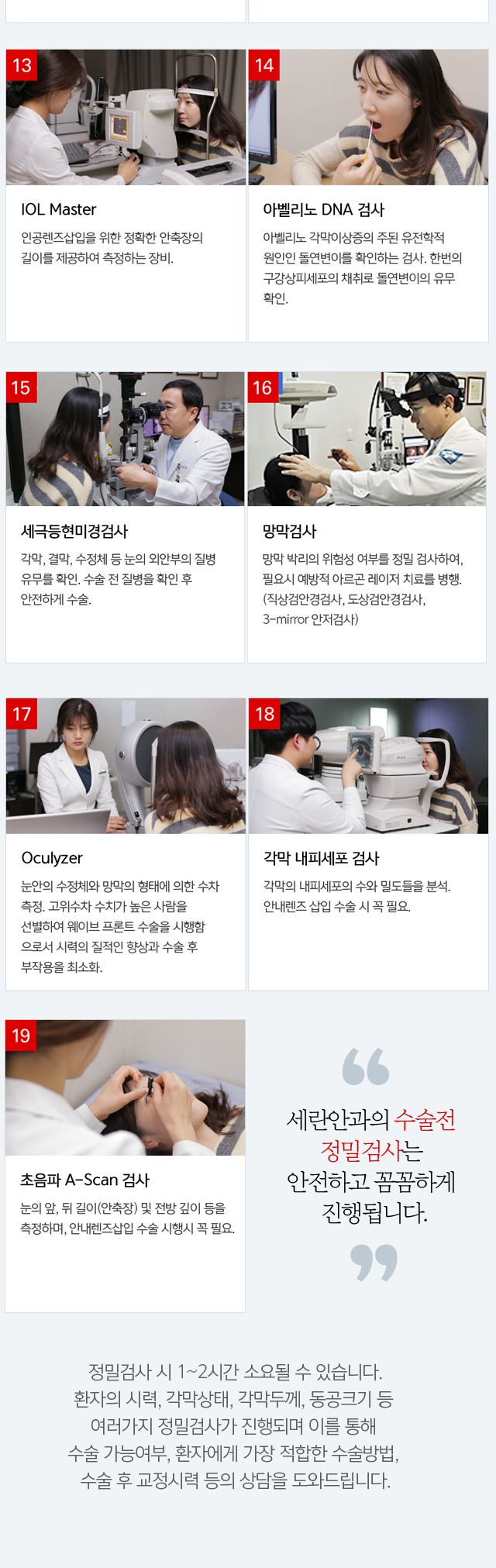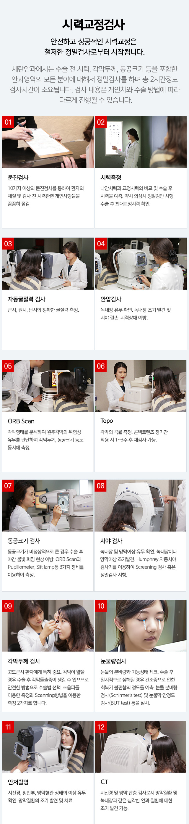 세란안과에서는 수술 전 시력, 각막두께, 동공크기 등을 포함한 안과영역의 모든 분야에 대해서 정밀검사를 하며 총 2시간정도 검사시간이 소요됩니다. 검사 내용은 개인차와 수술 방법에 따라 다르게 진행될 수 있습니다.